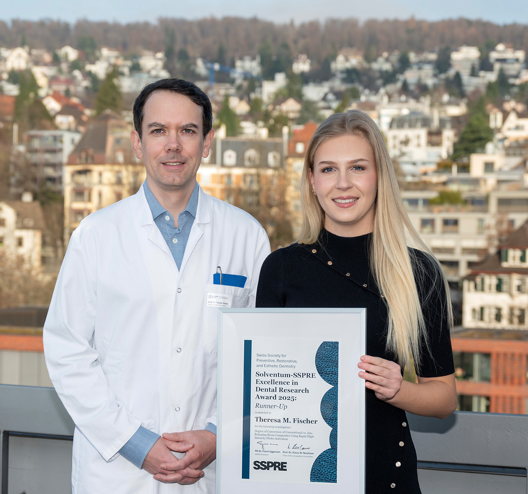 Frau Dr. Theresa Fischer wurde im Rahmen der 24. Jahrestagung der Schweizerischen Gesellschaft für Präventive, Restaurative und Ästhetische Zahnmedizin (SSPRE) mit dem Solventum-SSPRE Excellence in Dental Research Award 2025 – Runner-Up ausgezeichnet. Die Ehrung erfolgte für die Präsentation der Ergebnisse der Forschungsarbeit «Degree of Conversion of Conventional vs. Ion-Releasing Resin Composites Using Rapid High-Intensity Photo-Activation» (Arbeitsgruppe: T.M. Fischer, M. Par, T.T. Tauböck).